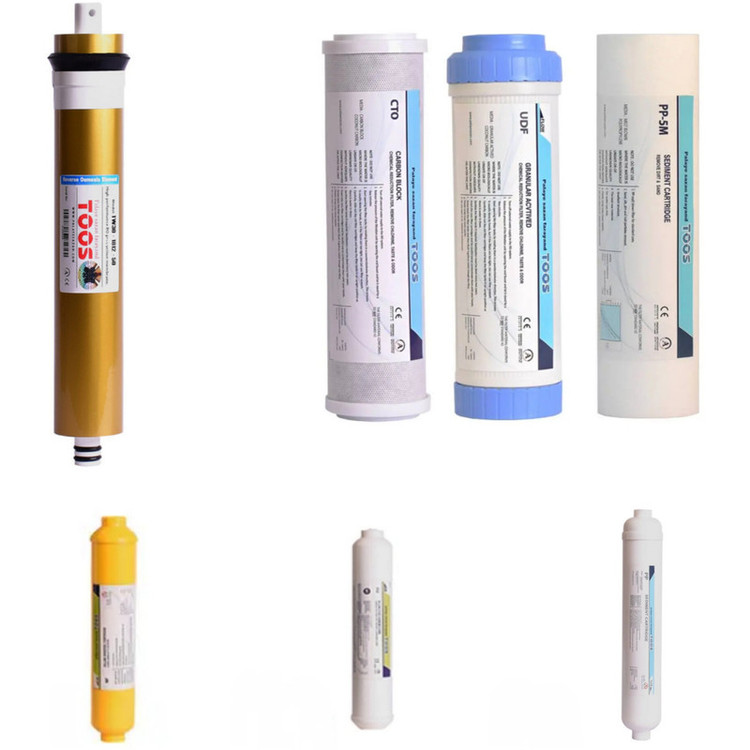 پک فیلتر ۷گانه تصفیه آب خانگی توس شامل 7 فیلتر مراحل مختلف دستگاه تصفیه آب خانگی است که عملکرد تصفیه آب را بهینه و کامل میکند. این مجموعه شامل فیلتر الیافی (PP)، کربن گرانول (UDF)، کربن بلاک (CTO)، فیلتر محافظ ممبران، ممبران اسمز معکوس (RO)،فیلتر پست کربن، و فیلتر مینرال است. این فیلترها قابلیت حذف ذرات معلق، آلایندههای شیمیایی، کلر، بو و طعم نامطبوع، باکتریها و همچنین غنیسازی آب با مواد معدنی ضروری را دارند. پک 7 مرحلهای توس با کیفیت بالا و قیمت مناسب، انتخابی ایدهآل برای کاربران دستگاههای تصفیه آب خانگی و افرادیست که خواهان ارتقا دستگاه تصفیه آب خانگی خود به 7 مرحله ای هستند.
